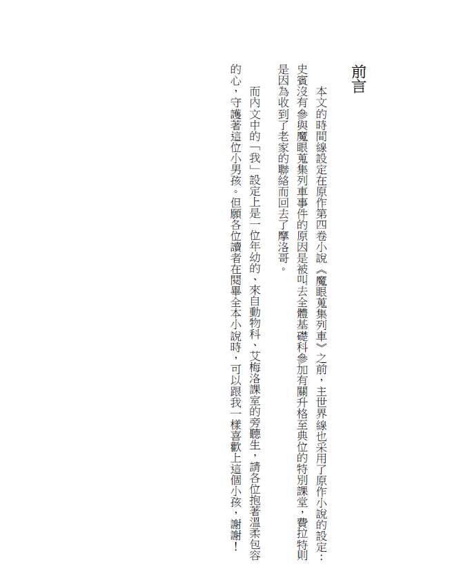 而內文采用第一人稱,設定中的「我」是一位年幼的、來自動物科、艾梅洛課室的旁聽生,請各位抱著溫柔包容的心,守護著這位小男孩。