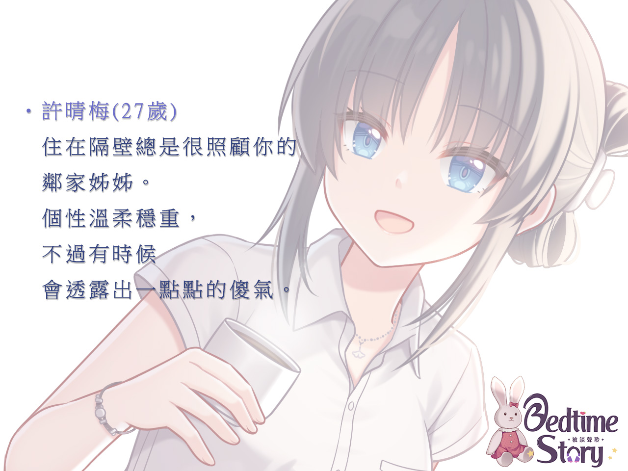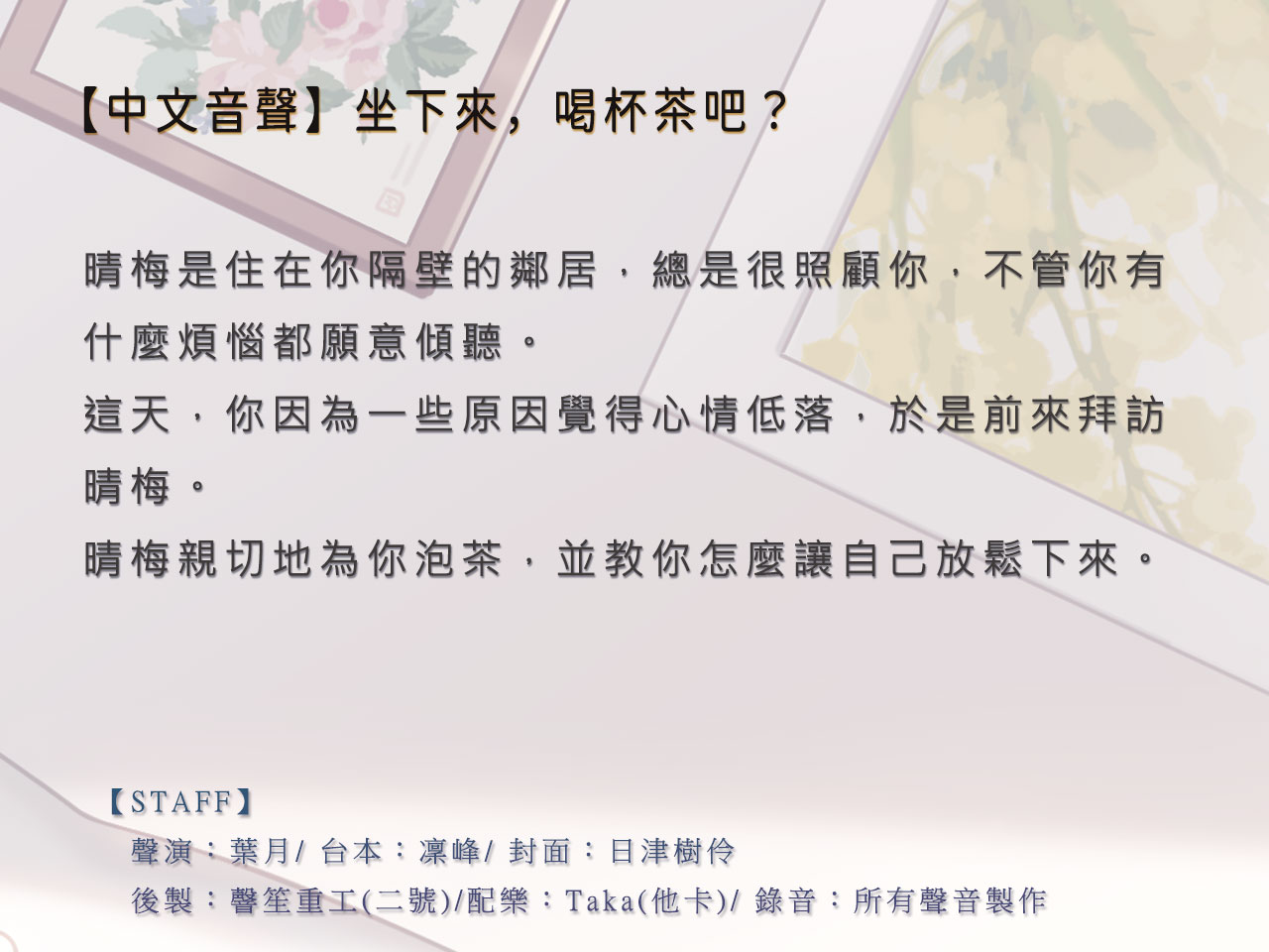 晴梅是你住在你隔壁的鄰居,總是很照顧你,不管你有什麼煩惱都願意傾聽。這天,你因為一些原因覺得心情低落,於是前來拜訪晴梅。晴梅親切地為你泡茶,並教你怎麼讓自己放鬆下來。
