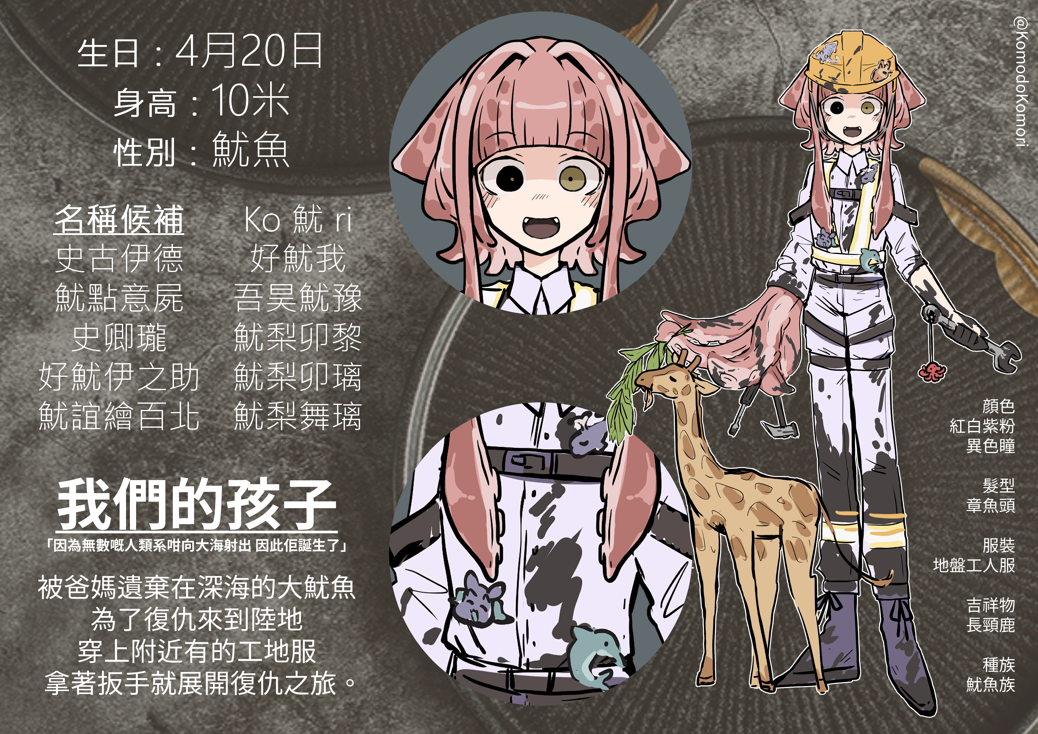 名稱候補:史古伊德 / 魷點意屍 / 史卿瓏 / 好魷伊之助 / 魷誼繪百北 / Ko 魷 ri / 好魷我 / 吾昊魷豫 / 魷梨卯黎 / 魷梨卯璃 / 魷梨舞璃