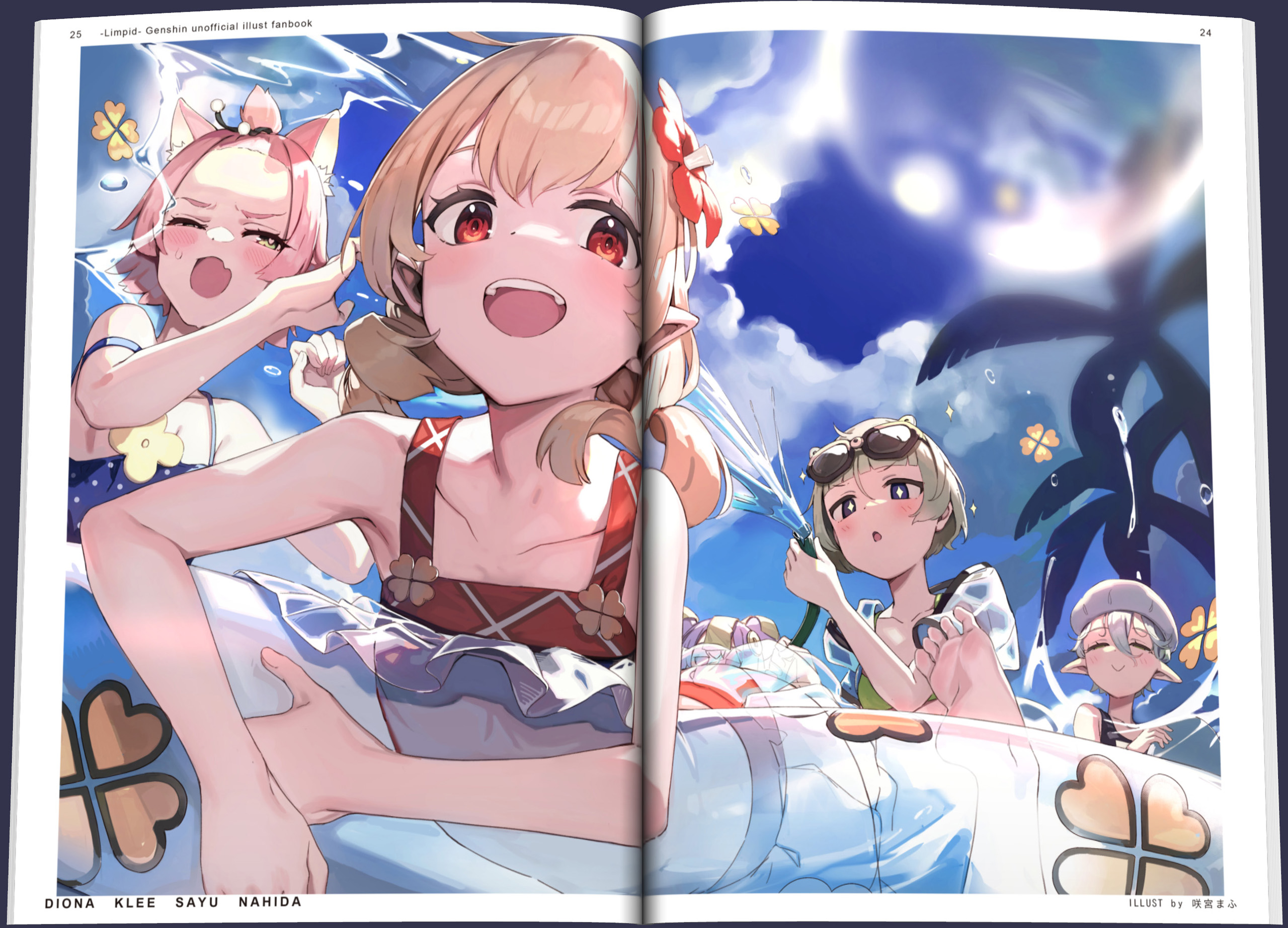 「Limpid」原神合同誌 收錄了雷電将軍、芭芭拉、甘雨、可莉、納西妲、派蒙等共計18個角色。這本合同誌為日本印刷,B5/36p(含封面)的全彩插畫集,將於台灣FF41與日本Comic Market同步發表的豪華套組在此登場!!有著清爽夏日相契合的水邊的一幕、有如塔羅牌的美麗的圖像、圓滾可代的SD圖、也有些性感的cut!?