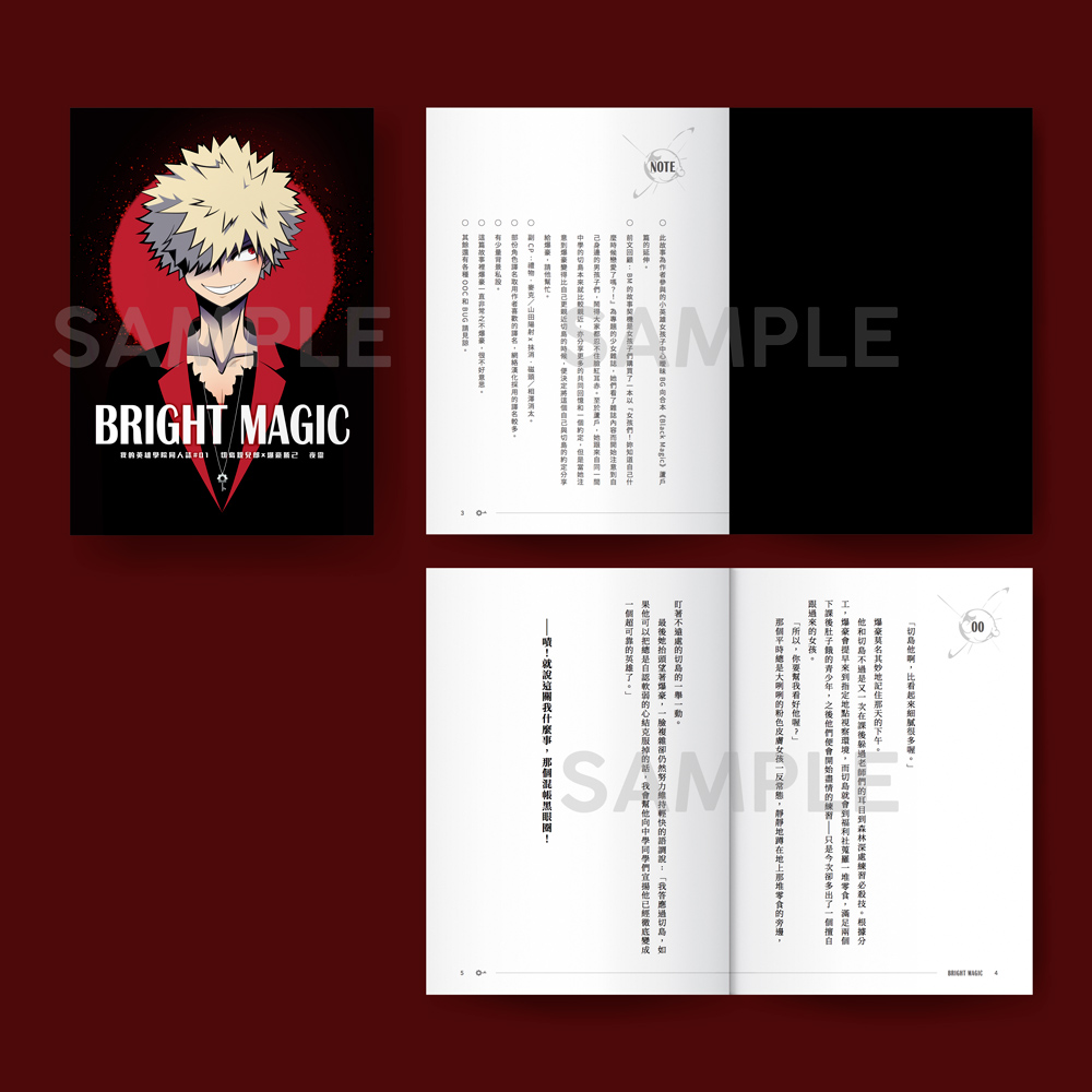 刊物資料:▽ 書名:《BRIGHT MAGIC》▽ 作者:夜靈▽ 出版:銀星夜空▽ 原作:我的英雄學院▽ CP:切爆▽ 字數:4萬字▽ 規格:B6右翻/128頁▽ 場販價格:250NTD/55HKD