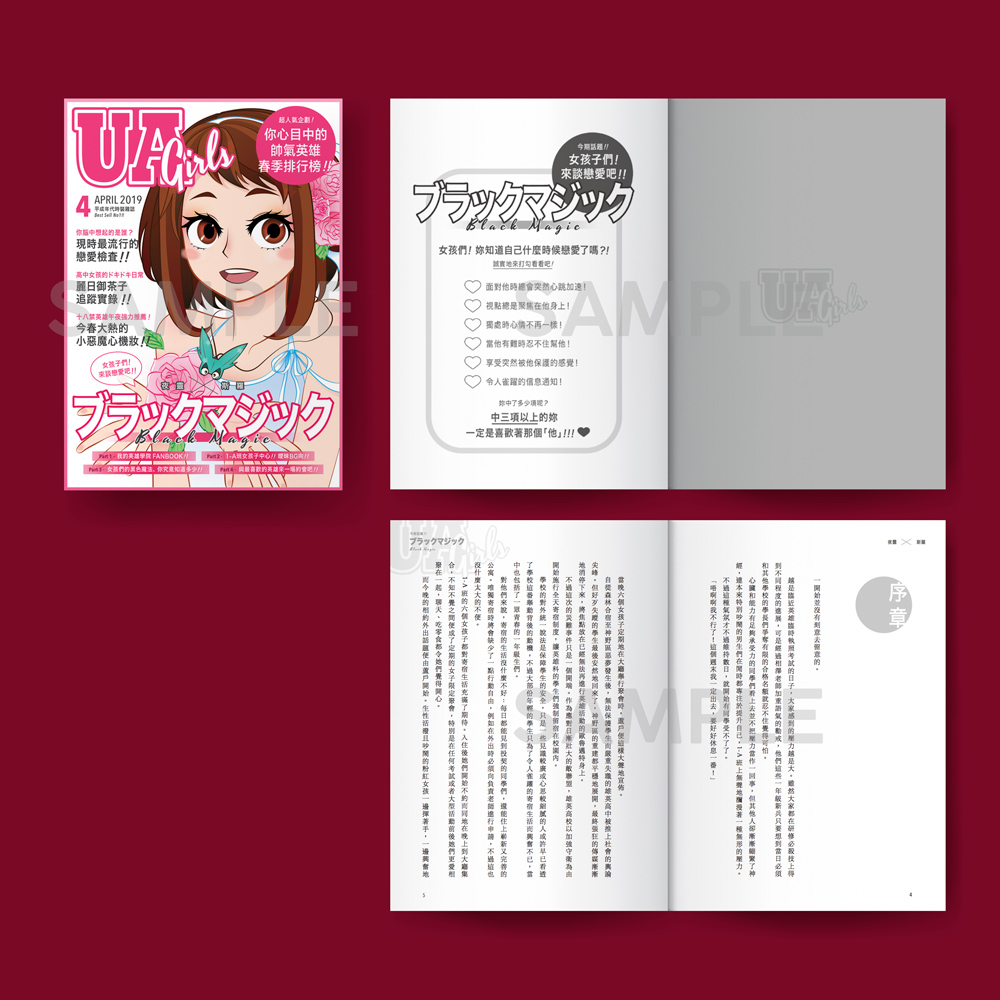 刊物資料:▽ 書名:《BLACK MAGIC》▽ 作者:夜靈、斯羅▽ 出版:銀星夜空▽ 原作:我的英雄學院▽ 角色:1-A班女子中心,微BG官配▽ 字數:約2.7萬字▽ 規格:A5右翻/82頁▽ 場販價格:180NTD/40HKD