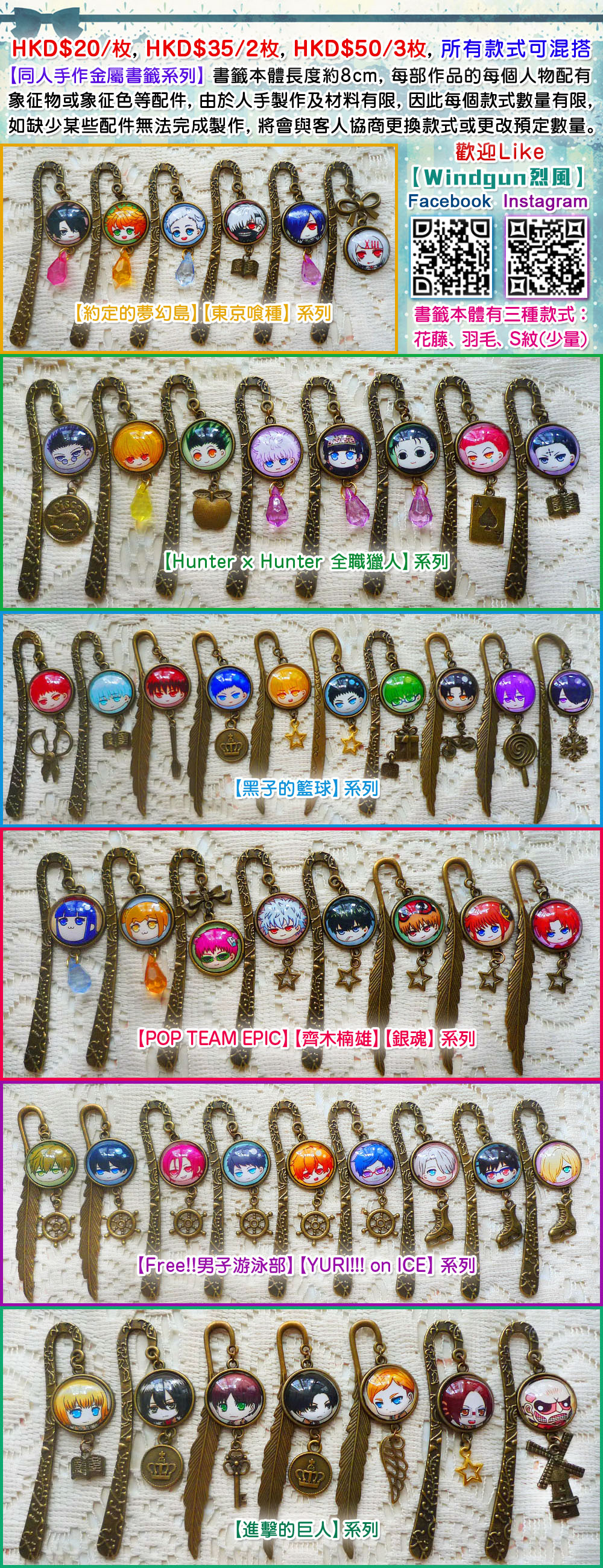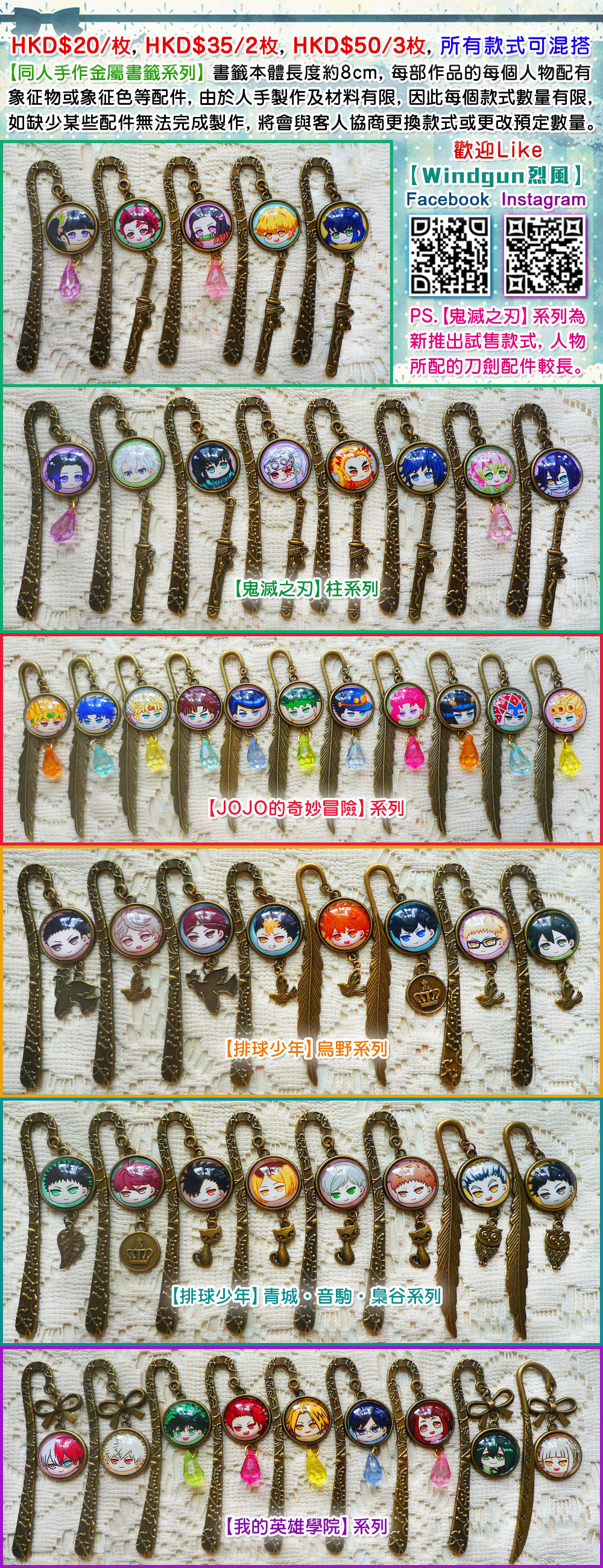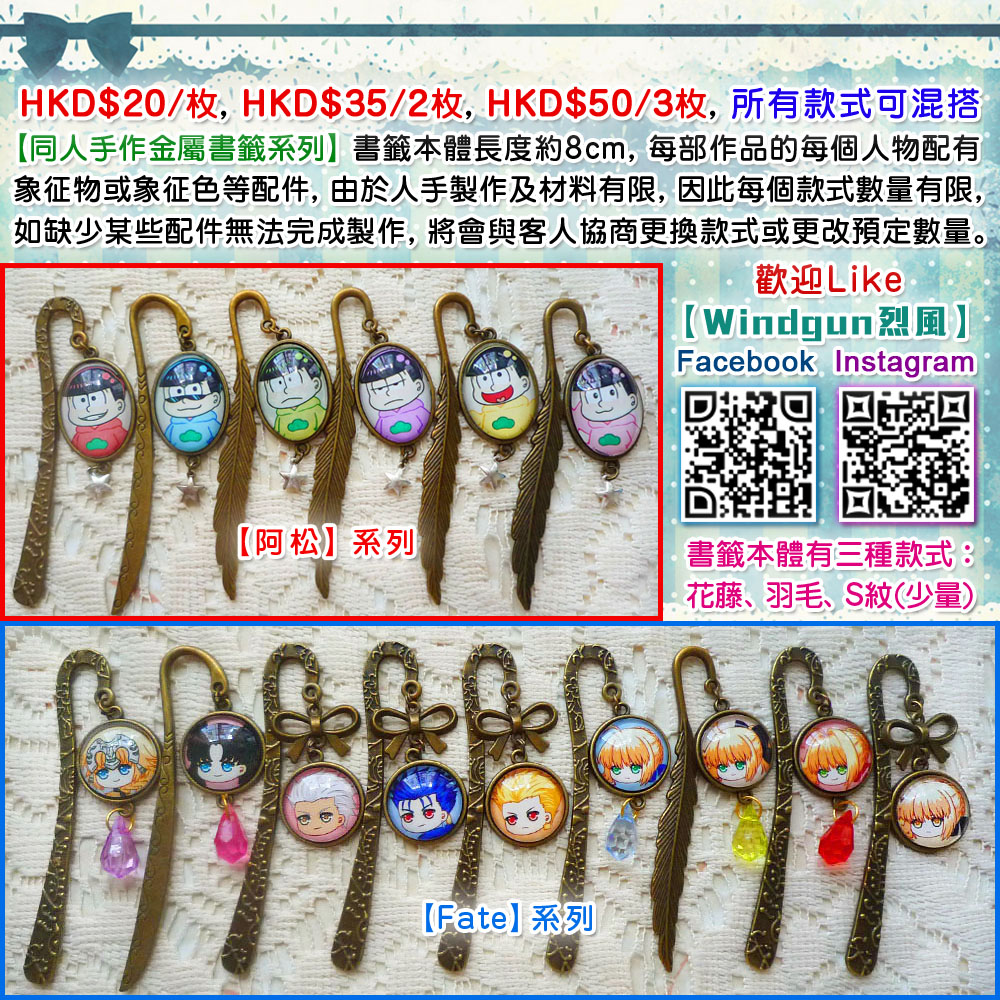 【同人手作金屬書籤系列】書籤本體長度約8cm, 每部作品的每個人物配有象征物或象征色等配件, 由於人手製作及材料有限, 因此每個款式數量有限, 如缺少某些配件無法完成製作, 將會與客人協商更換款式或更改預定數量。