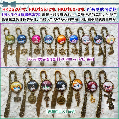 主營同人手作金屬文具&飾物:金屬書籤、金屬間尺、CP髮夾、CP手環、全員手環、金屬掛件、迷你風鈴,耳機塞 etc.